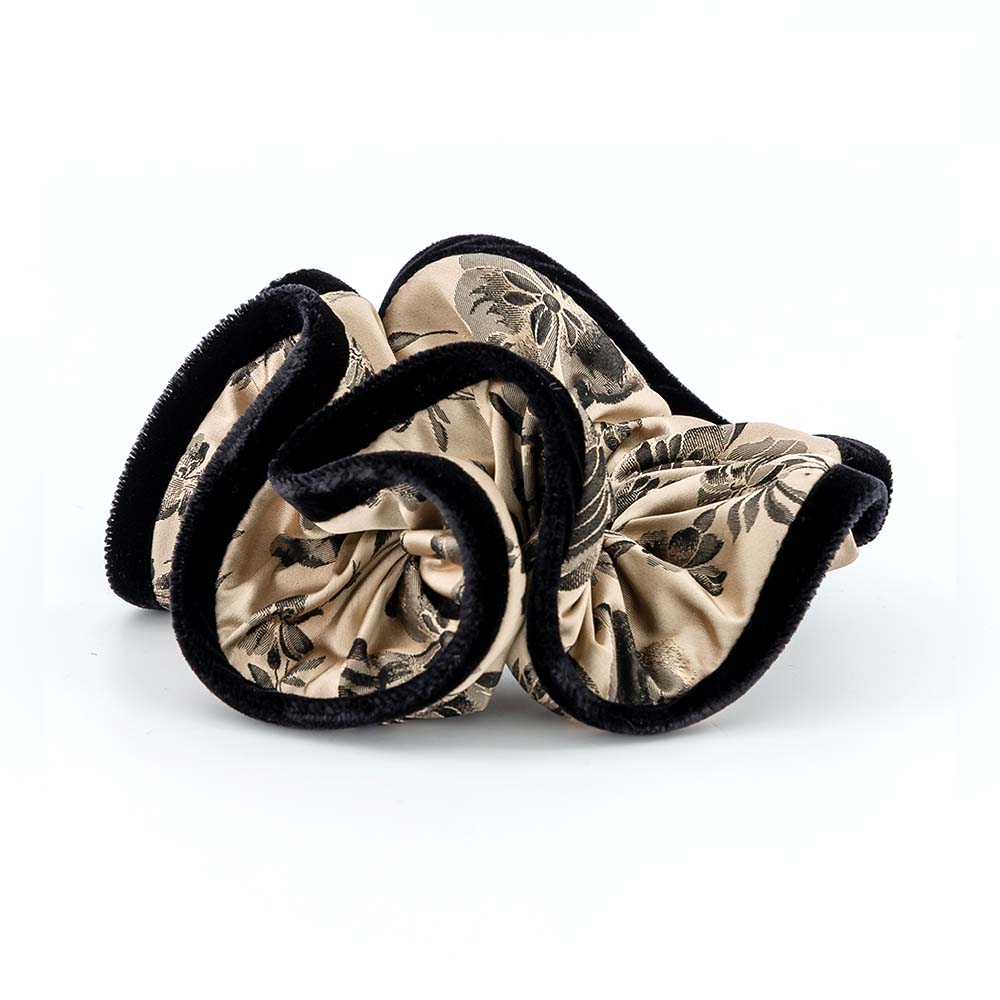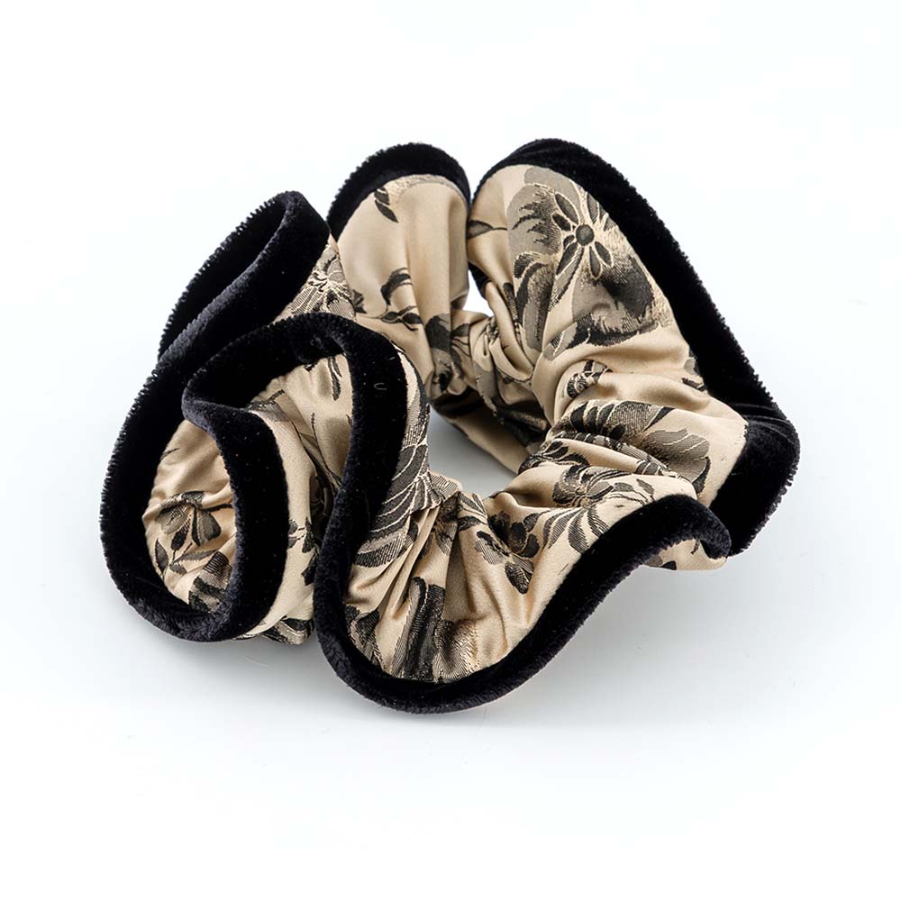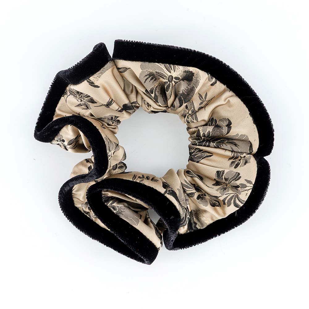 Der Chouchou BEIGE COUTURE besticht durch die edle Kombination eines beigen Grundstoffs mit zartem Blumenmuster und tiefschwarzem Seidensamt. Dieser ausdrucksstarke Kontrast verleiht dem Scrunchie Charakter und eine subtile Weiblichkeit. Ob zur Aufwertung einer Alltagsfrisur oder als eleganter Akzent zu einem formelleren Outfit – dieses Accessoire lässt sich vielseitig kombinieren.
