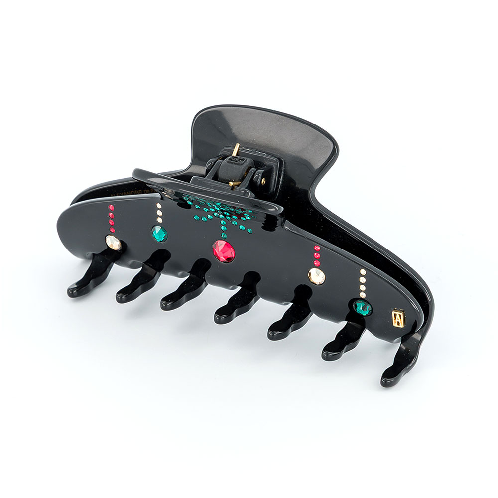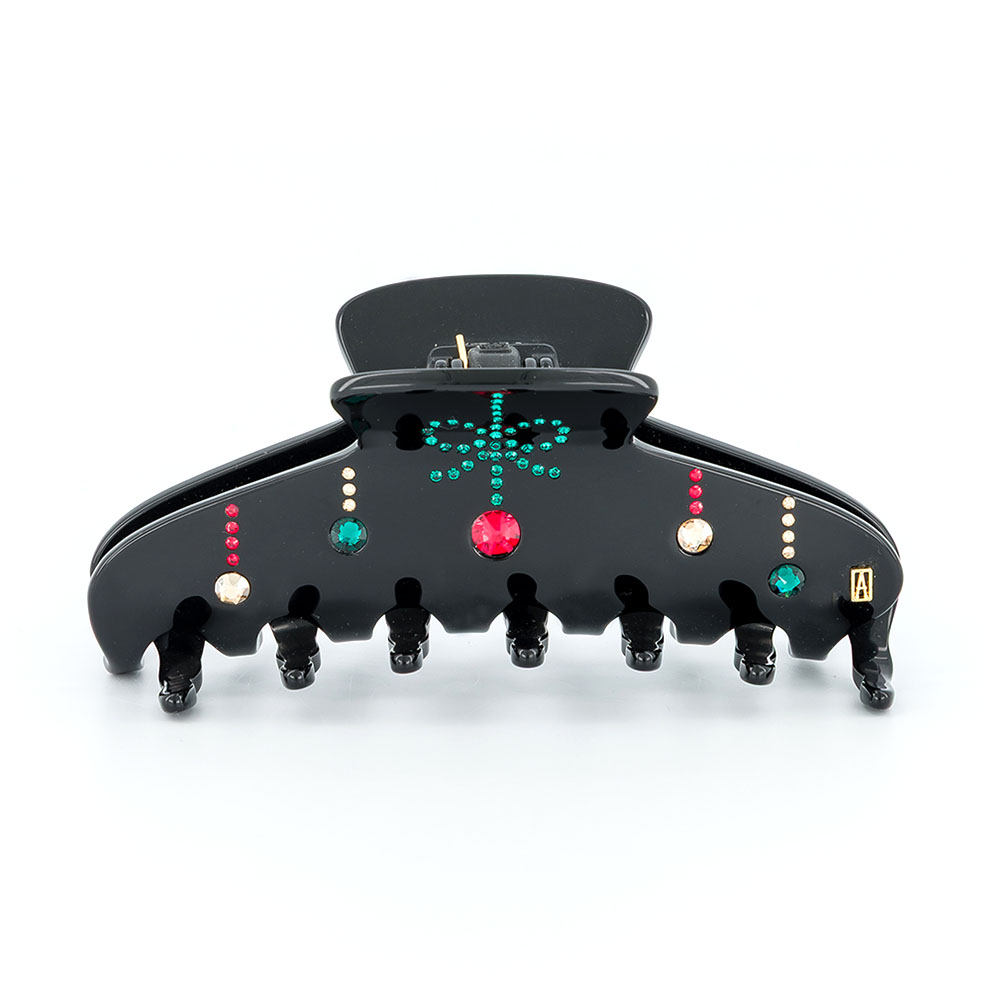 Die LUMIÈRES DE NOËL Haarklammer überzeugt durch ihre ausgewogene Kombination aus schlichter Form und detailreicher Verzierung. Grüne, goldene und rote Kristalle erinnern an leuchtende Girlanden und setzen vor dunklem Hintergrund farbenfrohe Akzente mit einem zarten, lebendigen Lichtspiel.