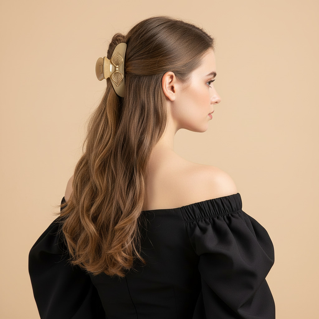 Die besondere Federmechanik macht die Haarklammer besonders angenehm in der Anwendung: weich beim Öffnen, aber stark genug, um normales bis dichtes Haar sicher den ganzen Tag zu halten. Die nahezu unsichtbare Feder trägt zur eleganten Gesamtwirkung bei und sorgt für einen hochwertigen Look.