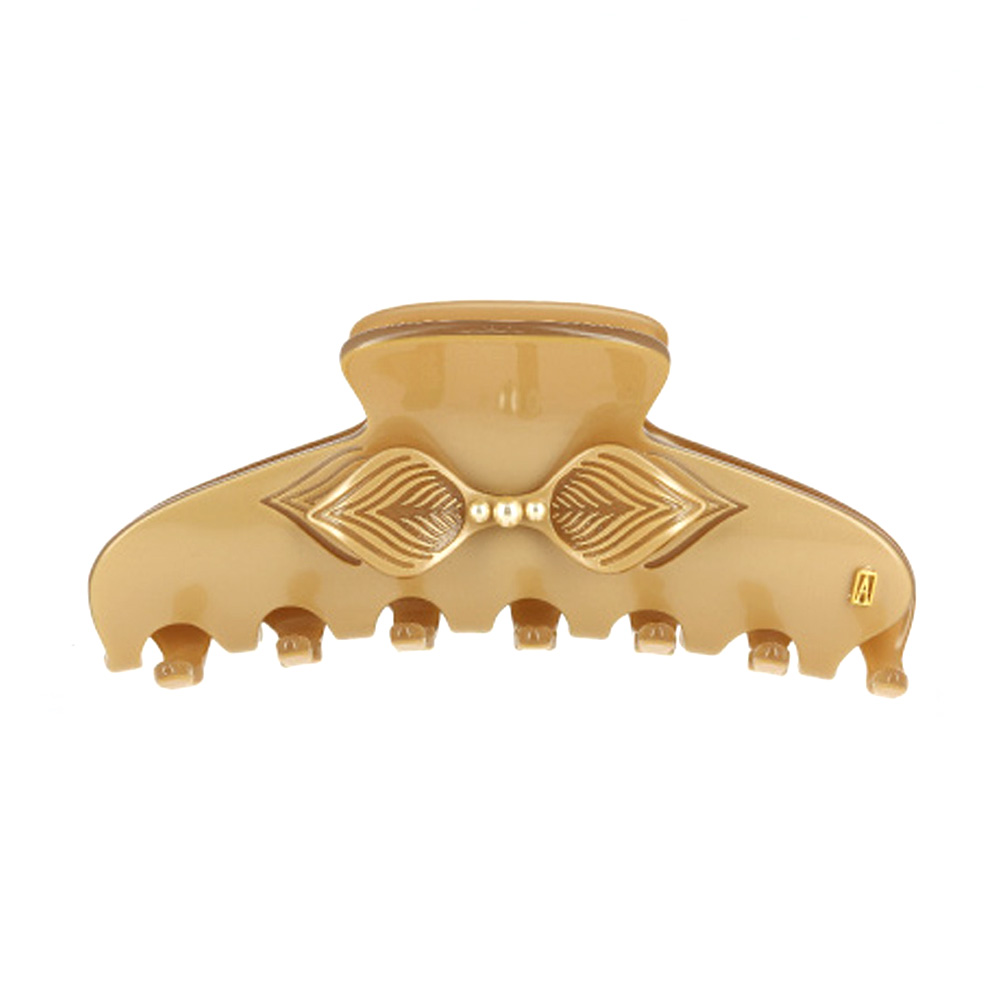 Die SILLAGES Haarklammer 11,5 cm interpretiert die ornamentale Ästhetik der Wiener Secession neu. Der doppelte Knoten, der an stilisierte Blätter erinnert, wird in der Mitte von feinen Perlen akzentuiert und verleiht dem Accessoire eine poetische, zeitlose Ausstrahlung.