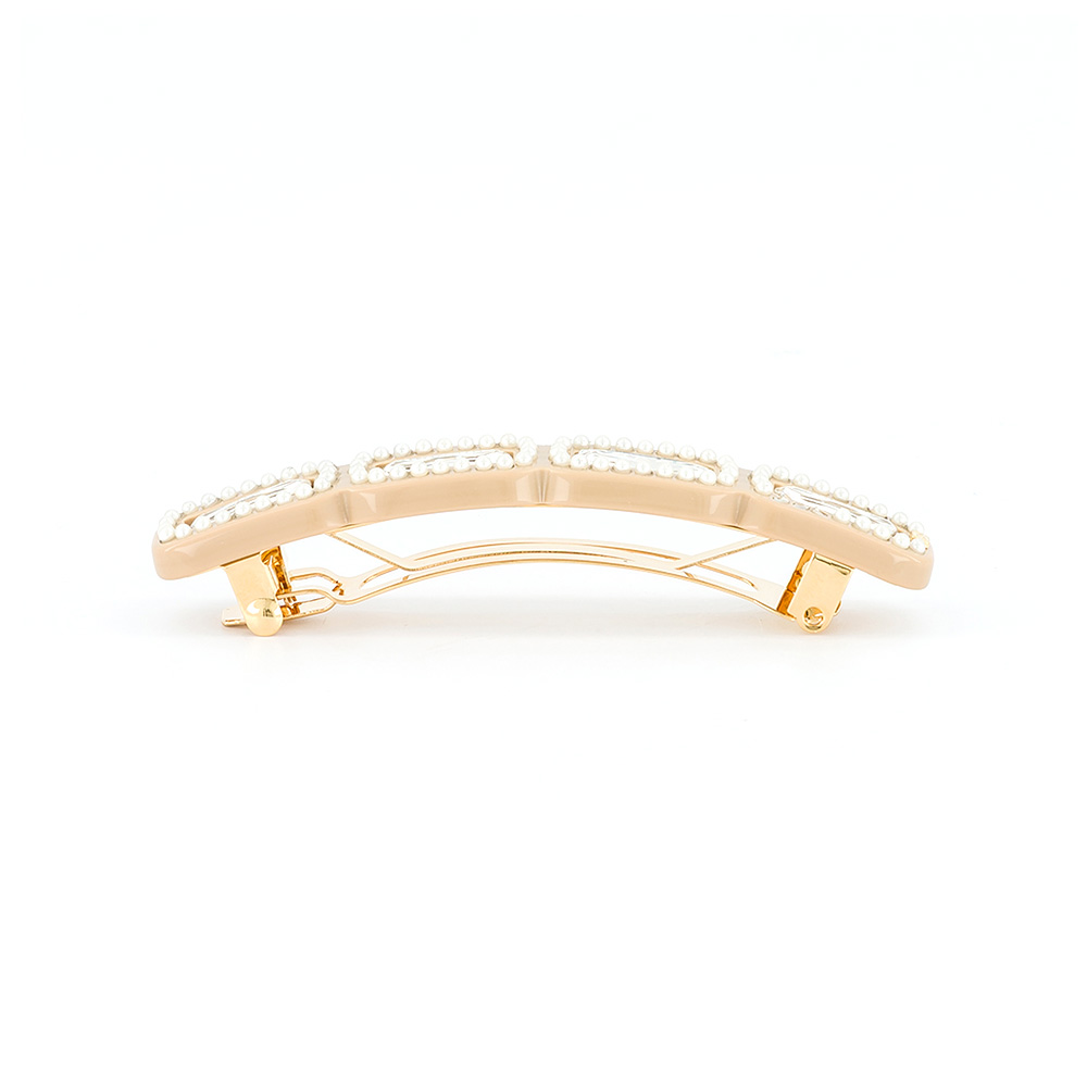 Das besondere Design der AFFABULATION Haarspange 8cm basiert auf einer Reihe von rechteckigen Elementen, die mit funkelnden Kristallen besetzt sind. Jedes dieser Elemente wird von einer feinen Kette aus zarten Perlen eingerahmt, wodurch ein luxuriöser, raffinierter Look entsteht. Dieses kunstvolle Zusammenspiel aus Kristallen und Perlen verleiht der Haarspange eine edle Ausstrahlung und macht sie zu einem stilvollen Highlight in jeder Frisur.
