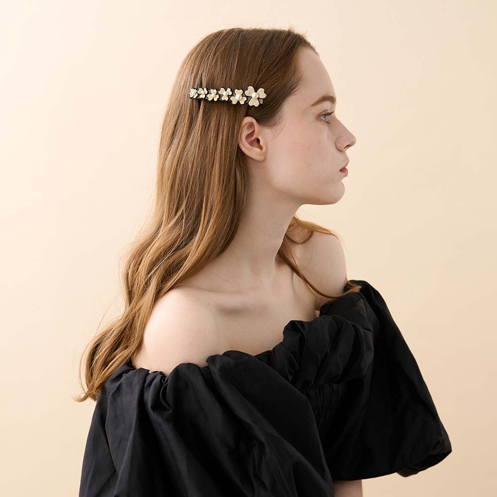Die CORDE SENSIBLE Haarspange 8 cm stammt aus der „Confrontation“-Kollektion und interpretiert die Begegnung zwischen Mensch und moderner Ästhetik auf poetische Weise. Das feine Blumenmuster aus dreiteiligen Blüten in unterschiedlichen Größen verleiht dem Accessoire einen sanften Rhythmus. Jede Blütenmitte ist mit einer leuchtenden Perle akzentuiert – ein elegantes Detail, das zeitlose Anmut ausstrahlt.