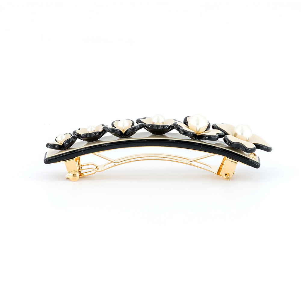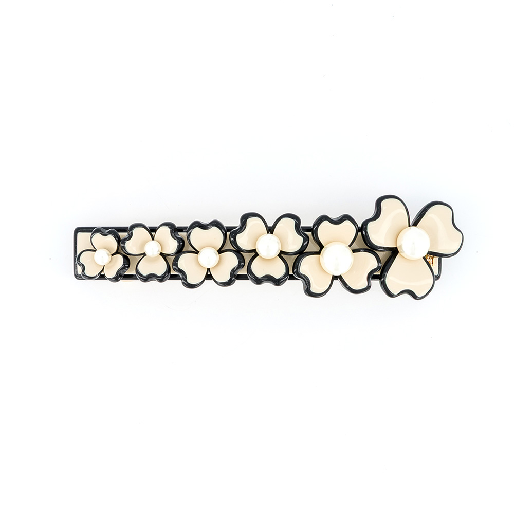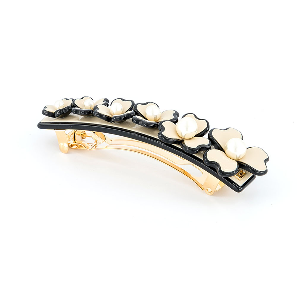 Die Alexandre de Paris Haarspange CORDE SENSIBLE 8 cm vereint zarte Eleganz und moderne Symbolik. Das filigrane Blumenmuster mit dreiteiligen Blüten und leuchtenden Perlen sorgt für einen raffinierten, harmonischen Look. Mit Patentverschluss ideal für normales bis dichtes Haar – handgefertigt in Frankreich aus hochwertigem Acetat.