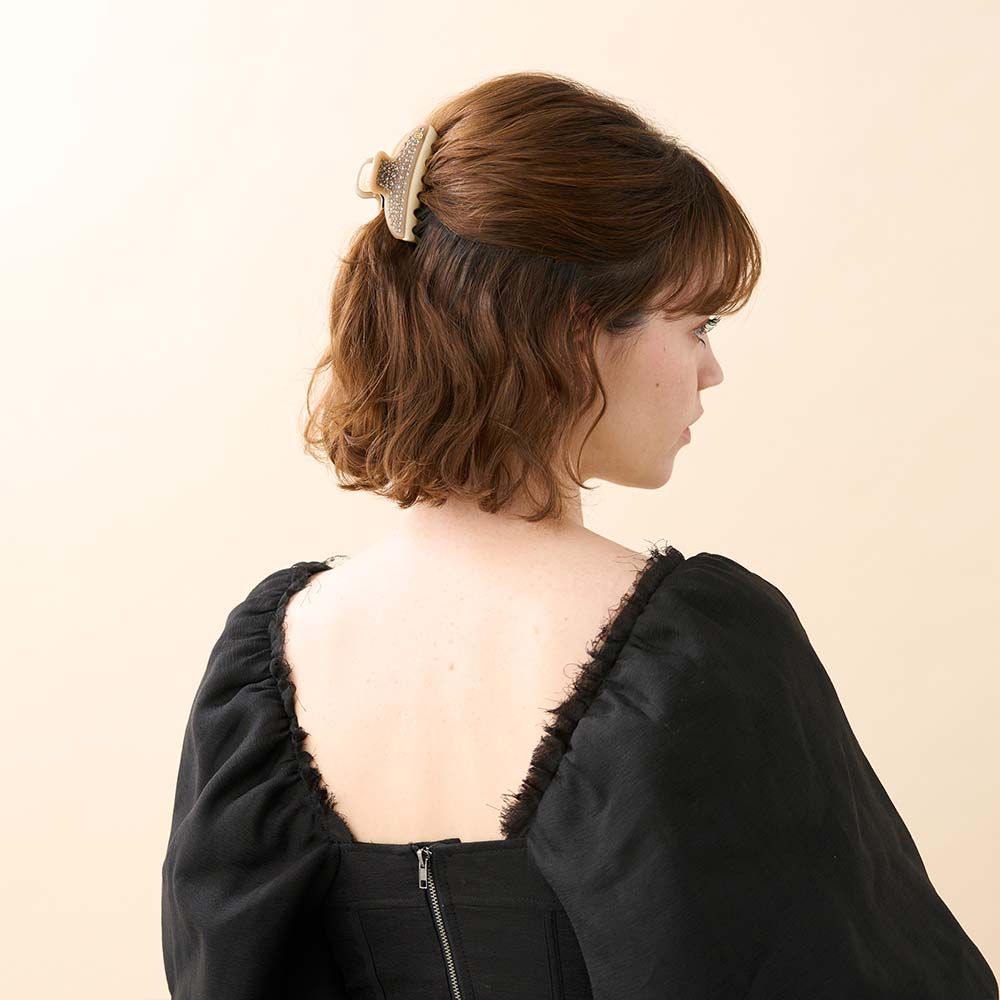 Die Pince Vendôme SOLEIL COUCHANT 7,5cm ist mit funkelnden Swarovski-Kristallen verziert und verleiht Ihrem Haar eine besondere Strahlkraft. Die Flügel bestehen aus hochwertigem Acetat, das aus Baumwollblüten und Holzzellstoffen gewonnen wird – ein edles, langlebiges Material mit einzigartigem Glanz. Die vergoldeten Zähne aus robustem ABS sorgen für Stabilität und unterstreichen den luxuriösen Charakter dieser exklusiven Haarklammer von Alexandre de Paris.