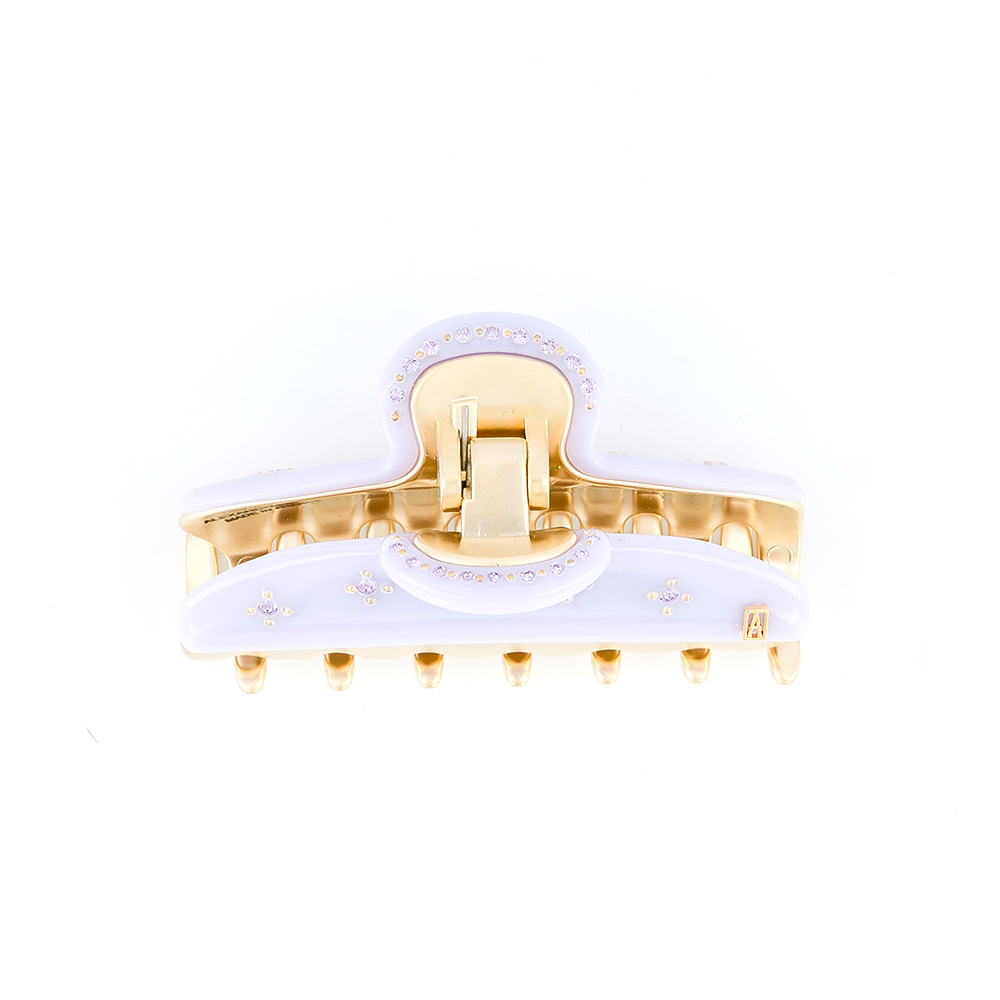 Die Alexandre de Paris – Pince Vendôme SOLEIL LEVANT 7,5 cm „Strassblumen“ ist ein handgefertigtes Schmuckstück fürs Haar: weich öffnende, unsichtbar integrierte Feder mit zuverlässigem Halt, vergoldete Zähne aus ABS, Flügel aus edlem Acetat und funkelnde Swarovski-Kristalle. Empfohlen für normales bis dichtes Haar – perfekt für elegante Alltags- und Abendlooks.