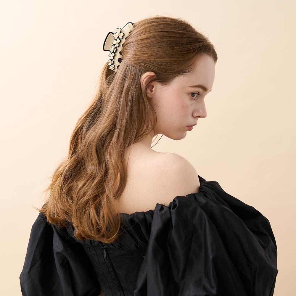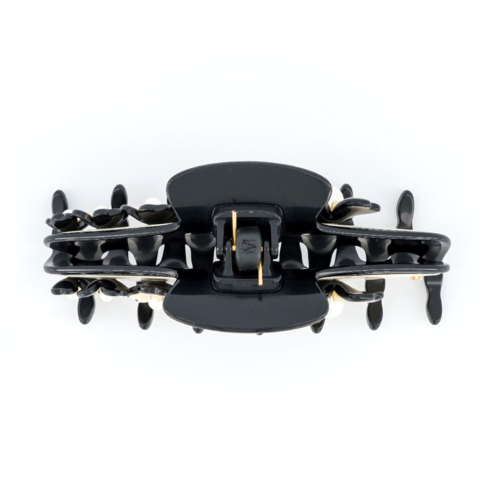 Die CORDE SENSIBLE Haarklammer 11,5 cm ist Teil der „Confrontation“-Kollektion, die die Verbindung von Mensch und moderner Ästhetik in symbolisch-zarter Form interpretiert. Das raffinierte Blumenmuster mit dreiteiligen Blüten in verschiedenen Größen erzeugt einen sanften Rhythmus, während die leuchtenden Perlen in der Blütenmitte dem Accessoire zeitlose Eleganz verleihen.