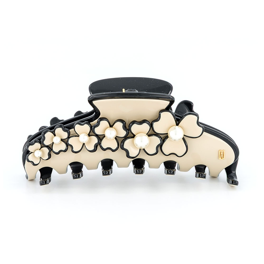 Die Alexandre de Paris Haarklammer CORDE SENSIBLE 11,5 cm begeistert mit zartem Blumenmuster, harmonischen Farben und leuchtenden Perlen in jeder Blütenmitte. Die nahezu unsichtbare, weich-starke Feder sorgt für komfortablen Halt bei normalem bis dichtem Haar. Handgefertigt in Frankreich aus hochwertigem Acetat.